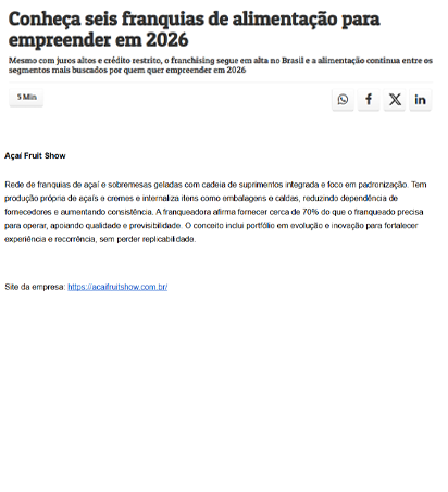 “Ser parte do Açaí Fruit Show foi uma das melhores decisões que tomei. Com todo o suporte que recebi desde o início, minha franquia rapidamente superou as espectativas e apresentamos um faturamento acima da média.